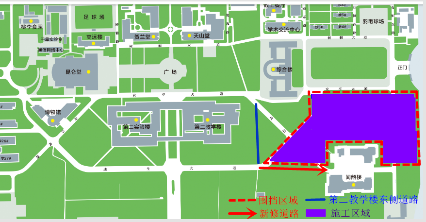 榆中校区人文社科组团I项目施工过程中,前期对通往闻韶楼西侧道路进行围挡封闭。目前闻韶楼西侧新建道路施工完成,安亭大道围挡已拆除,已具备人员和车辆通行条件。现将前往闻韶楼、榆中校区车队的人员和车辆通行路线进行调整,具体安排如下: